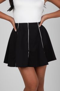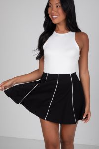 The By The Rules Black Mini Skirt is designed for a summer full of affogatos and city strolls! Featuring a sleek, streamlined silhouette, this versatile skirt is perfect for dressing up or down. The flattering mini length adds a touch of edge, while the solid black color makes it easy to pair with everything from graphic tees to dressy blouses. Whether you’re heading out for a night on the town or keeping it casual during the day, this skirt is your go-to for chic, effortless style! Stretchy Lightweight Woven Knit Fabrication White Stripe Accents Elastic Waistband High-Waisted Flowy Fit Short/Mini Length 67% Rayon, 29% Nylon, 4% Elastane Hand Wash Cold, Lay Flat to Dry Models are 5’2″ + 5’4″ and are wearing a Small.Garment Measurements in Inches:Small | Waist 24” (Stretches up to 28″) | Hips 40” | Length 14.5”Medium | Waist 26” (Stretches up to 30″) | Hips 42” | Length 15”Large | Waist 28” (Stretches up to 32″) | Hips 44” | Length 16”