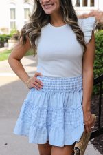 You’ll be the main event every time you wear the Charmed Feeling Blue Gingham Tiered Mini Skirt! Featuring a timeless gingham print, this skirt is designed with a flattering smocked elastic waistband for a comfy, flexible fit. The tiered silhouette adds flirty movement and a touch of volume, making it perfect for picnics, weekend getaways, or sunny strolls. Just pair it with a simple tank or tucked-in tee for an effortlessly adorable look! Lightweight Woven Knit Fabrication Gingham Print Smocked Elastic Waistband Flowy Tiered Fit Short/Mini Length Fully Lined Self: 92% Polyester, 8% Nylon Lining: 100% Polyester Hand Wash Cold, Lay Flat to Dry Models are 5’0″ + 5’9.5″ and are wearing a Small.Garment Measurements in Inches:Small | Waist 26″ (Stretches up to 32″) | Hips 40″ | Length 15″Medium | Waist 28″ (Stretches up to 34″) | Hips 42″ | Length 15.5″Large | Waist 30″ (Stretches up to 36″) | Hips 44″ | Length 16″
