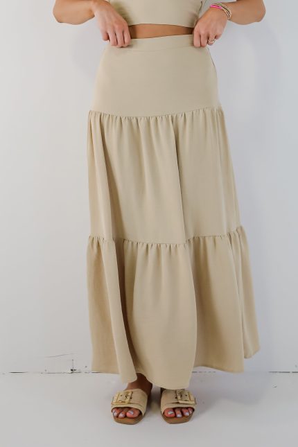 Feel flawless all night long with an effortlessly party-ready look like the Exceptionally Styled Linen Maxi Skirt! Made from lightweight, breathable linen, it features a flowy tiered silhouette that moves with you and an easy elastic waistband for all-day comfort. Whether you’re strolling the beach or heading to brunch, this skirt pairs perfectly with anything from a fitted tank to a relaxed blouse. Dress it up or down—either way, you’ll stay cool and stylish! Available in 2 colors. Lightweight Crinkle Linen Fabrication Smocked Elastic Waistband Flowy Fit Slit on Right Side Maxi Length Made in the USA 100% Cotton Hand Wash Cold, Hang or Line Dry Models are 5’0″ + 5’6″ and are wearing a Small.Garment Measurements in Inches:Small | Waist 22″ (Stretches up to 30″) | Hips 48″ | Length 38″Medium | Waist 24″ (Stretches up to 32″) | Hips 50″ | Length 39″Large | Waist 26″ (Stretches up to 34″) | Hips 52″ | Length 39.5″X-Large | Waist 28″ (Stretches up to 36″) | Hips 54″ | Length 40″