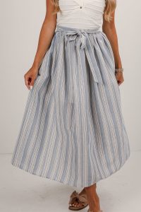 Playful yet polished, the Feels Like Love Blue Striped Midi Skirt demands everyone’s attention! Featuring soft, vertical blue stripes and a lightweight, breezy fabric, this skirt is perfect for warm days and sunny strolls. The adjustable tie waist adds a flattering, customizable fit, while the flowy midi silhouette offers graceful movement with every step. Pair it with a tucked-in tank or blouse for a fresh and feminine look that’s perfect for brunch, vacations, or everyday wear! Lightweight Cotton-Blend Fabrication Striped Print Elastic Waistband in the Back Functional Tie Front Flowy Fit Midi Length Fully Lined Self: 50% Cotton, 50% Polyester Lining: 97% Polyester, 3% Spandex Hand Wash Cold, Hang or Line Dry Models are 5’4″ + 5’9.5″ and are wearing a Small.Garment Measurements in Inches:Small | Waist 26″ | Hips 38″ | Length 33″Medium | Waist 28″  | Hips 40″ | Length 33.5″Large | Waist 30″| Hips 42″ | Length 34″