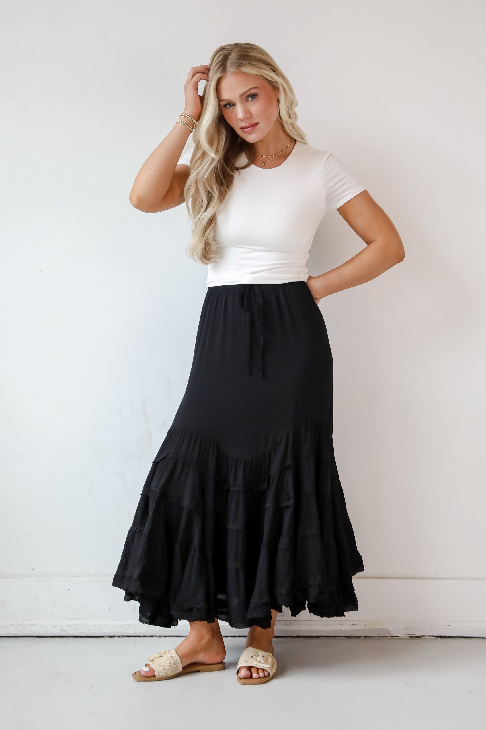 The Regal Romance Black Maxi Skirt is bursting with sweet and romantic vibes! This stunning skirt features a flowy fit with delicate ruffle details that add movement and elegance. The elastic waist cinches for a flattering fit, while the lightweight fabric keeps you comfortable all day long. Perfect for any occasion, this versatile skirt can be dressed up with heels and accessories or kept casual with sandals and a denim jacket! Lightweight Woven Knit Fabrication Elastic Waistband with Functional Drawstring Tie Flowy Fit Asymmetrical Tiered Ruffle Hem Maxi Length 100% Rayon Hand Wash Cold, Line Dry Model is 5’6″ and wearing a Small.Garment Measurements in Inches:Small | Waist 28″ (Stretches up to 32″) | Hips 34″ | Length 35″Medium | Waist 30″ (Stretches up to 34″) | Hips 36″ | Length 36″Large | Waist 32″ (Stretches up to 36″) | Hips 38″ | Length 37″