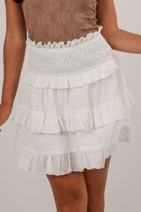 The Vivid Dreams White Tiered Ruffle Mini Skirt is a must-have piece for your summer wardrobe (and beyond)! This lightweight mini features a smocked elastic waistband for a comfy, flattering fit, while the tiered ruffle layers add volume and movement for a playful vibe. The crisp white fabric makes it easy to pair with anything from a crop top to a tucked-in blouse. Whether you’re headed to brunch or the beach, this skirt is ready to twirl through summer with you! Stretchy Textured Lightweight Woven Knit Fabrication Smocked Elastic Waistband High-Waisted Flowy Tiered Fit Short/Mini Length Fully Lined Self: 95% Polyester, 5% Spandex Lining: 100% Polyester Hand Wash Cold, Hang Dry Models are 5’4″ + 5’9.5″ and are wearing a Small.Garment Measurements in Inches:Small | Waist 24” (Stretches up to 32″) | Hips 34” | Length 18”Medium | Waist 26” (Stretches up to 34″) | Hips 36” | Length 18.5”Large | Waist 28” (Stretches up to 36″) | Hips 38” | Length 19”